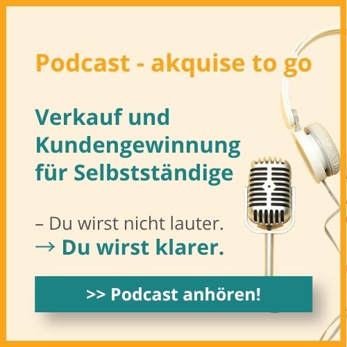 Im Podcast „akquise to go“ nehme ich dich mit in den echten Verkaufsalltag von Selbstständigen. Ungefiltert, praxisnah und aus über 24 Jahren Akquise- und Verkaufserfahrung.